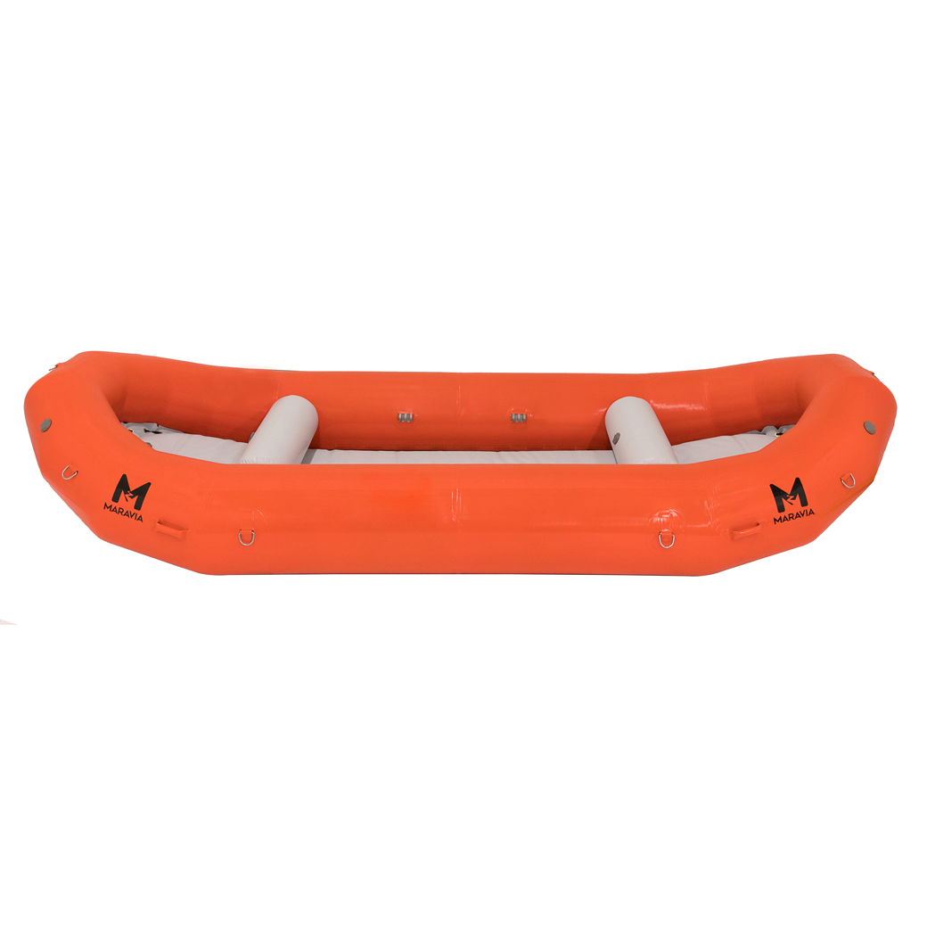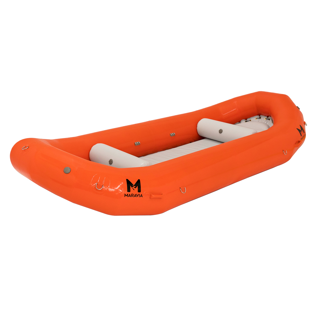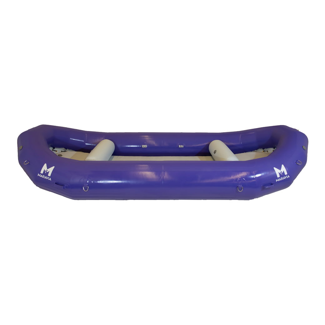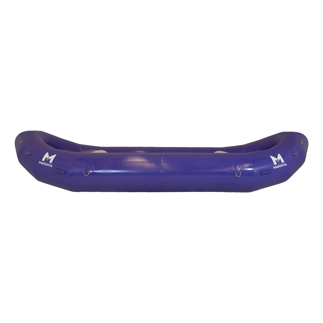 The sleek Maravia Zephyr is a larger version of the Diablo, or a diminishing tube version of the Williwaw 1.5.The tubes diminish in diameter from 21″ in the straight side sections down to 16″ in the bow and stern. This design provides more inside space for gear and people in the bow and stern, and is also an advantage when you encounter those upstream canyon winds in the afternoon.